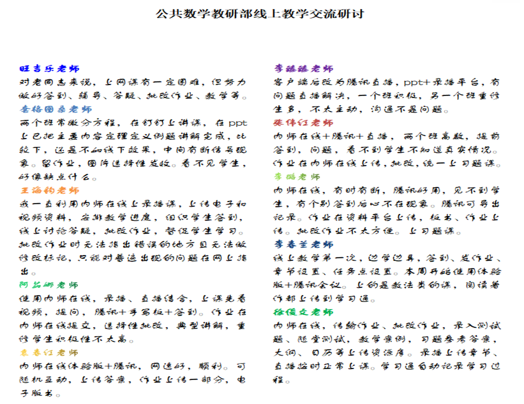 教研过程中,每位老师从思政元素融入课程、线上教学平台的合理使用、线上与线下教学的比较、员工的上课情况等多方面交流分享和现场展示各自线上教学好的经验做法,认真倾听,相互学习,彼此借鉴,达到凝聚智慧、奋力前行的良好效果。