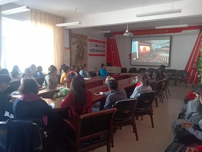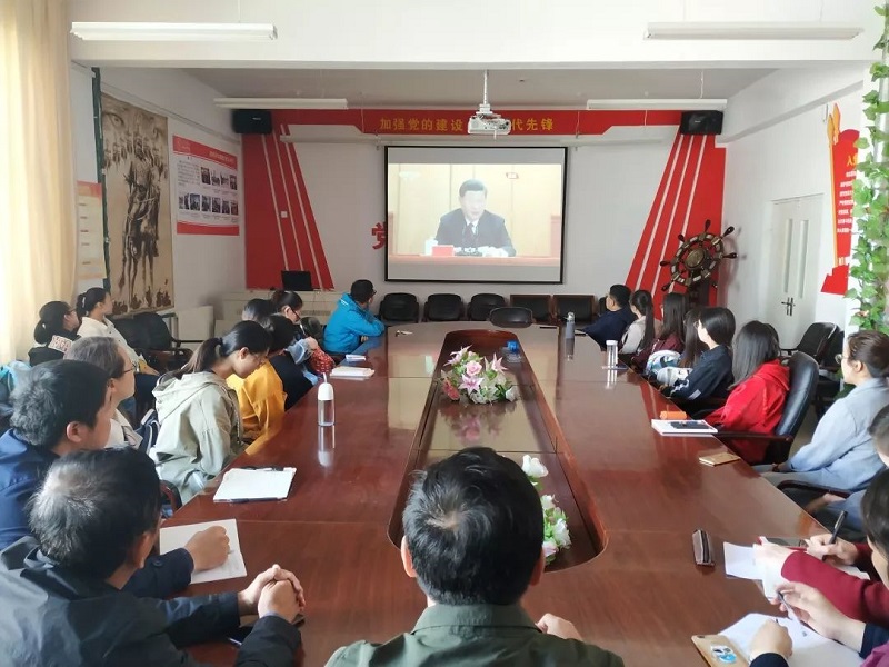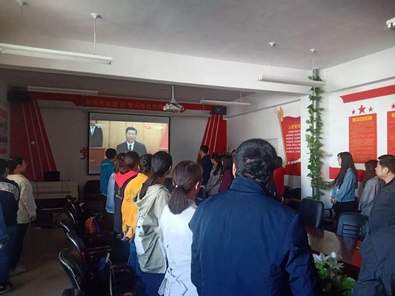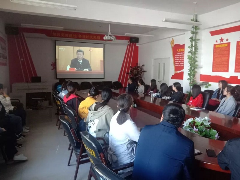 公司党总支书记扎其劳教授,公司党总支副书记、副经理季建光老师,督导员乾达门老师,团学干部3人,教师代表3人,团员36人于pa电子盛乐校区公司楼会议室观看大会直播。
