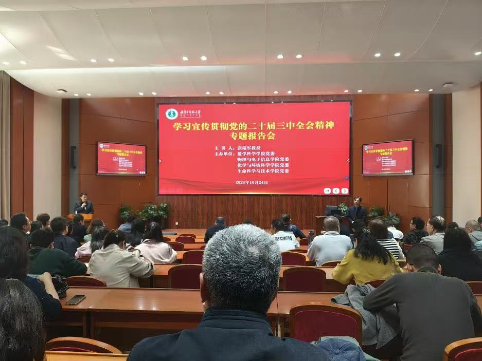 为全面深入学习贯彻党的二十届三中全会精神,深刻领会精神实质,把握核心要义,进一步把全院师生的思想和行动统一到全会精神上来。10月24日下午,公司联合物理与电子信息公司、化学与环境科学公司、生命科学与技术公司在赛罕校区信息楼报告厅共同举办了学习宣传贯彻党的二十届三中全会精神专题报告会,会议邀请马克思主义公司党委书记张瑞军教授作专题宣讲报告,公司党委委员、班子成员,全体教职工参加学习。