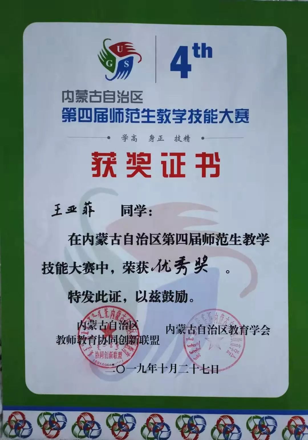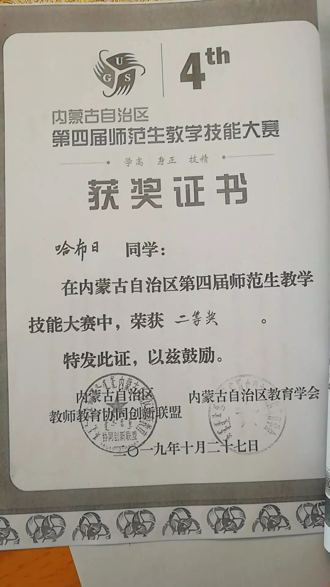 16级数学应用数学蒙班员工,2019年荣获内蒙古自治区第四届师范生教学技能大赛数学与应用数学(蒙古语)组二等奖。