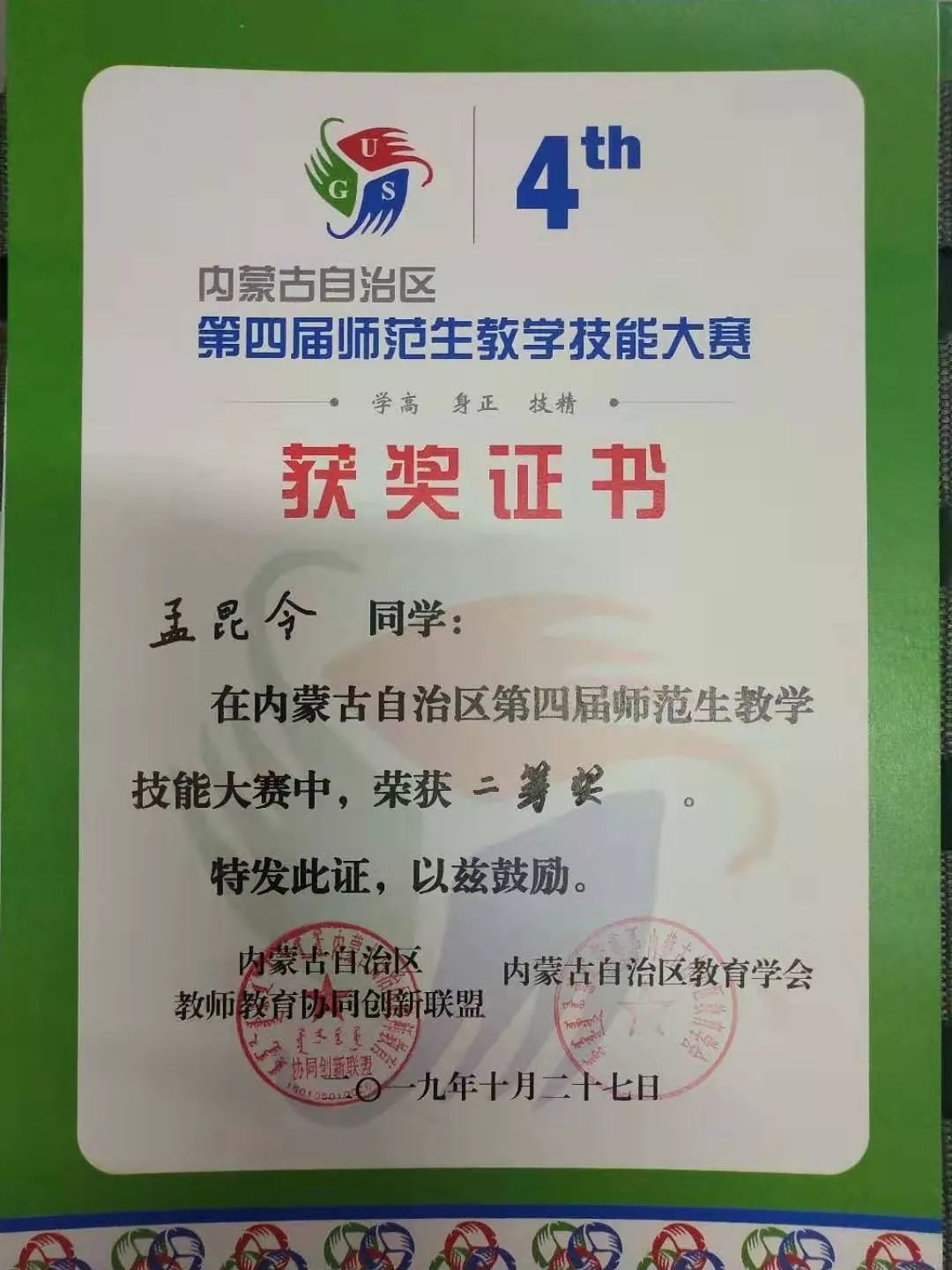 在于2019年10月25日至28日举办的内蒙古自治区第四届师范生教学技能大赛中,公司尼日嘎拉同学获得数学与应用数学(蒙古语)组一等奖;哈布日同学获得数学与应用数学(蒙古语)组二等奖;孟昆令同学获得数学与应用数学(汉语)组二等奖;王亚菲同学获得数学与应用数学(汉语)组优秀奖。
