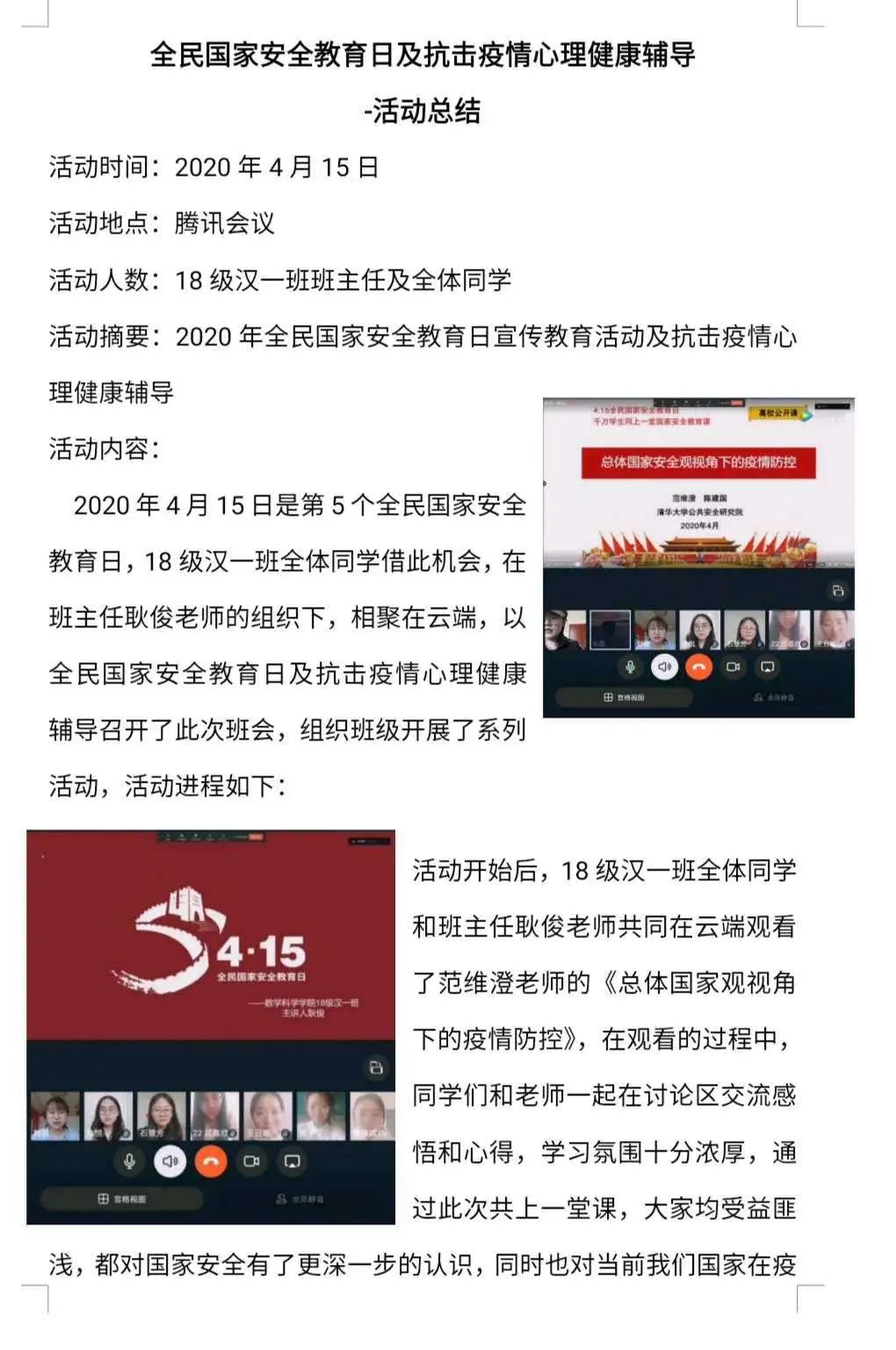 全民国家安全教育日(National Security Education Day)是为了增强全民国家安全意识,维护国家安全而设立的节日。为深入学习贯彻以习近平同志为核心的党中央关于疫情防控工作的决策部署,坚持总体国家安全观,响应国家安全教育,公司各班级围绕“增强国家安全意识”召开主题“云”班会进行学习和交流。