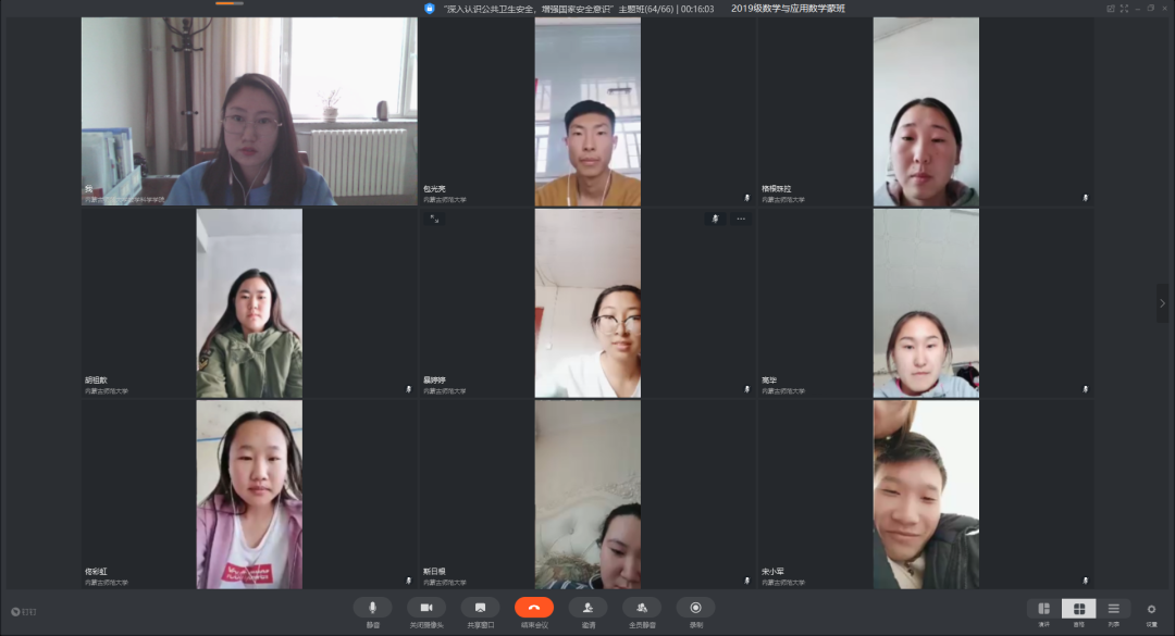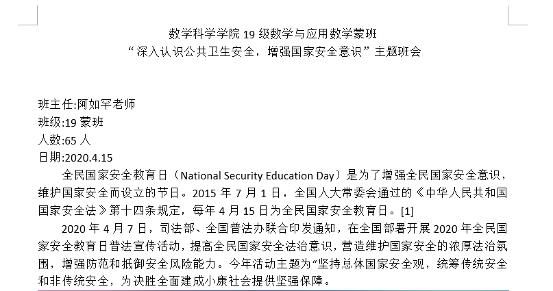 2020年4月15日是第5个“全民国家安全教育日”,为深入学习贯彻以习近平同志为核心的党中央关于疫情防控工作的决策部署,引导员工将总体国家安全观贯穿抗疫全过程,提升维护国家安全的自觉性和主动性。公司组织公司各班级通过各类网上交流平台开展“国家安全教育”为主题的线上主题班会。同学们共看国家安全教育公开课,并积极进行讨论。