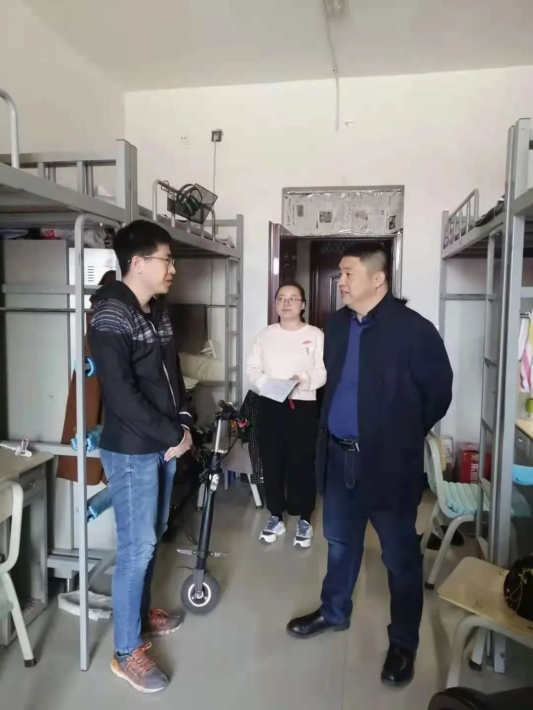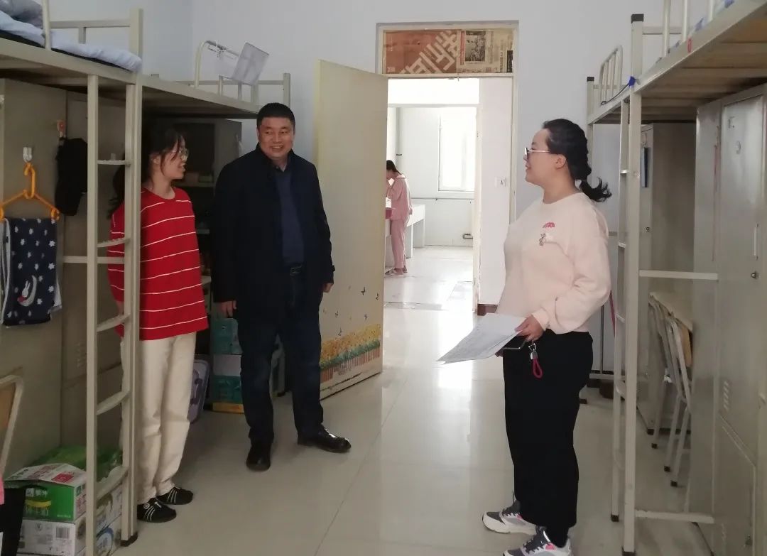 刘沙沙老师与同学们展开亲切的交流,关心同学们的学习、生活情况,对一些卫生情况好的宿舍提出表扬,并指出个别宿舍存在的不足之处。