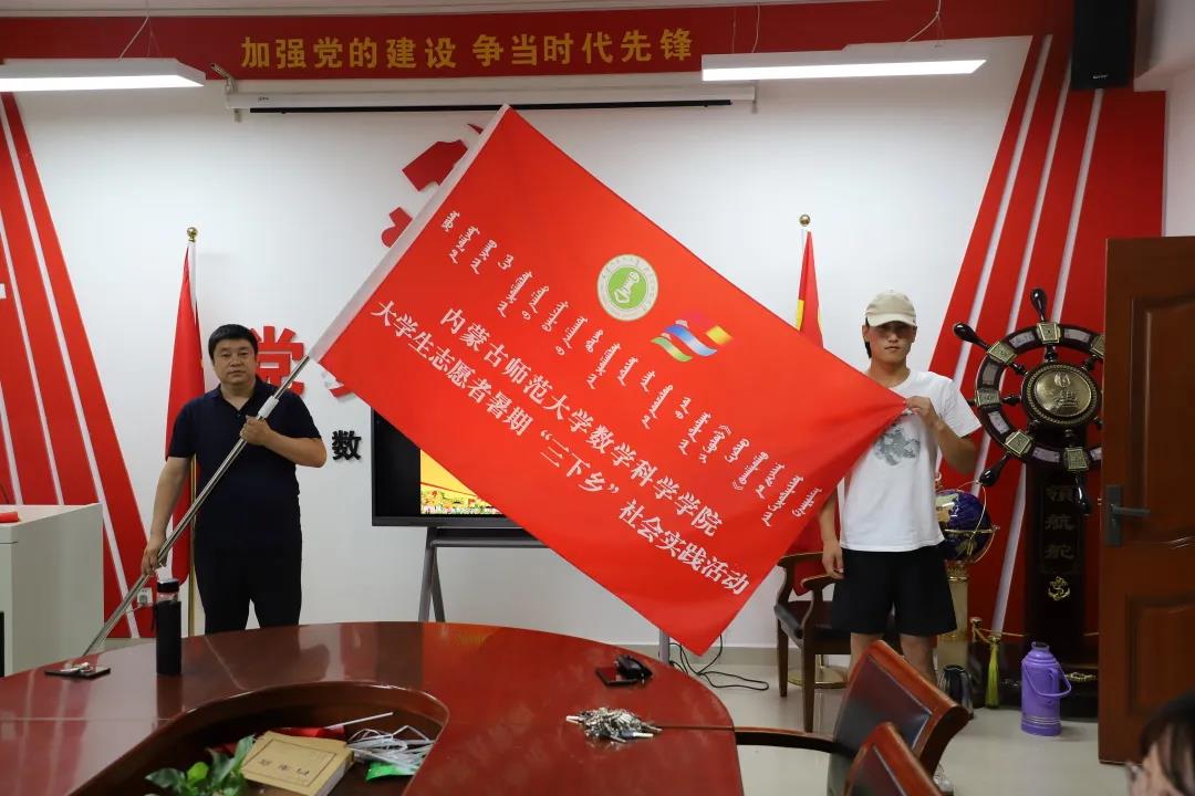 公司党委副书记、副经理季建光老师为志愿者代表19级蒙班邰心同学授旗。