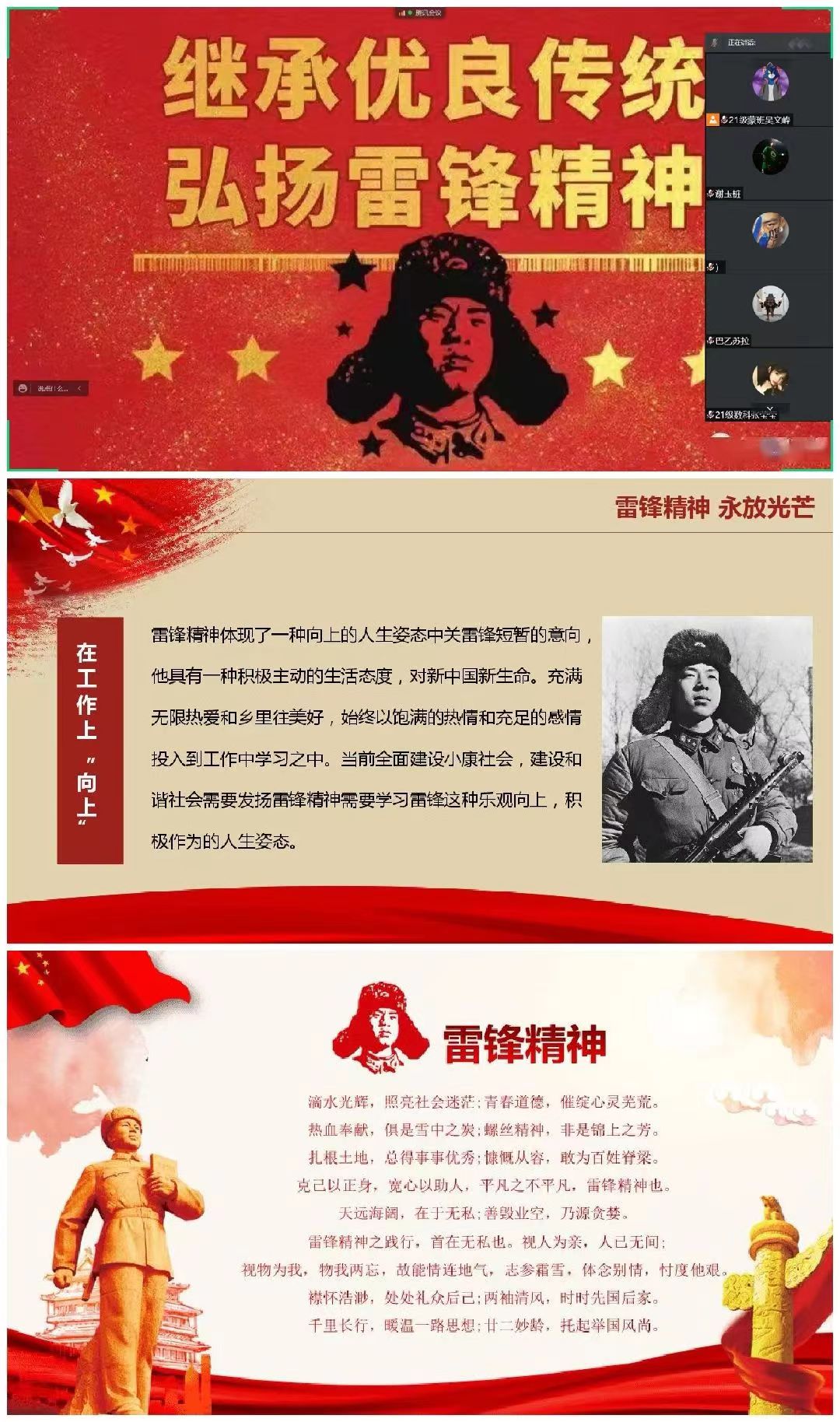 雷锋精神,是以雷锋的名字命名,以雷锋的精神为基本内涵,在实践中不断丰富和发展着的革命精神,是中华民族传统美德的一种积淀,是一种随着时代进步而不断发展的与时俱进的精神。