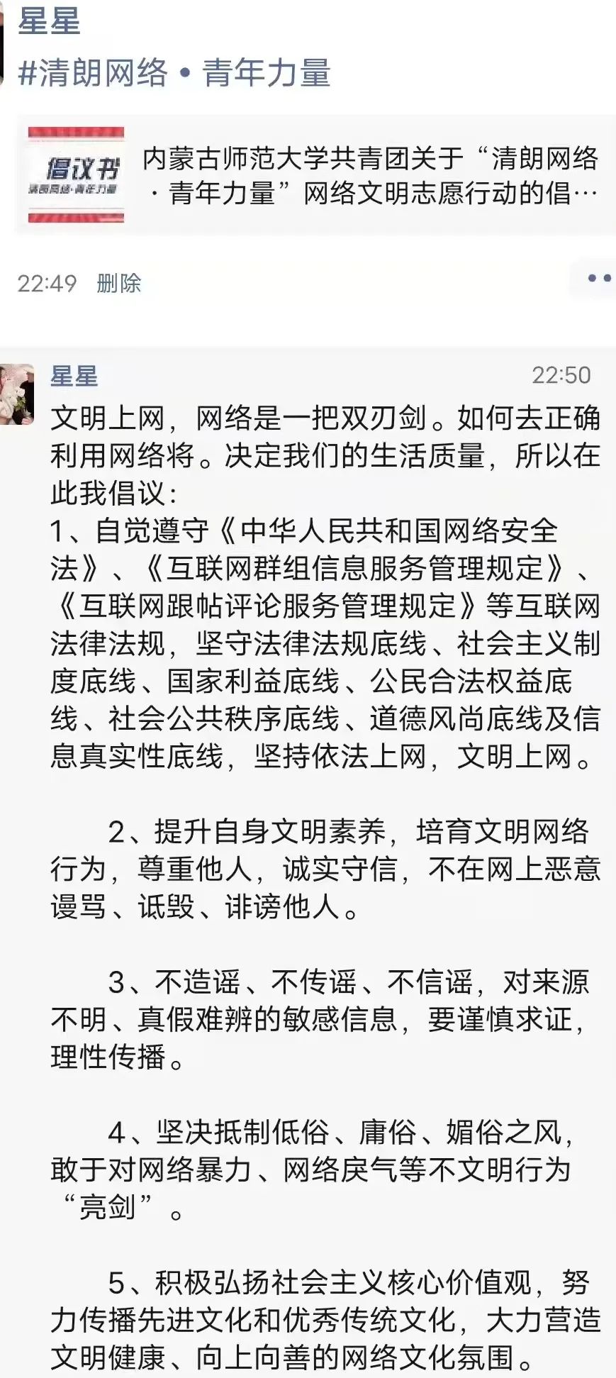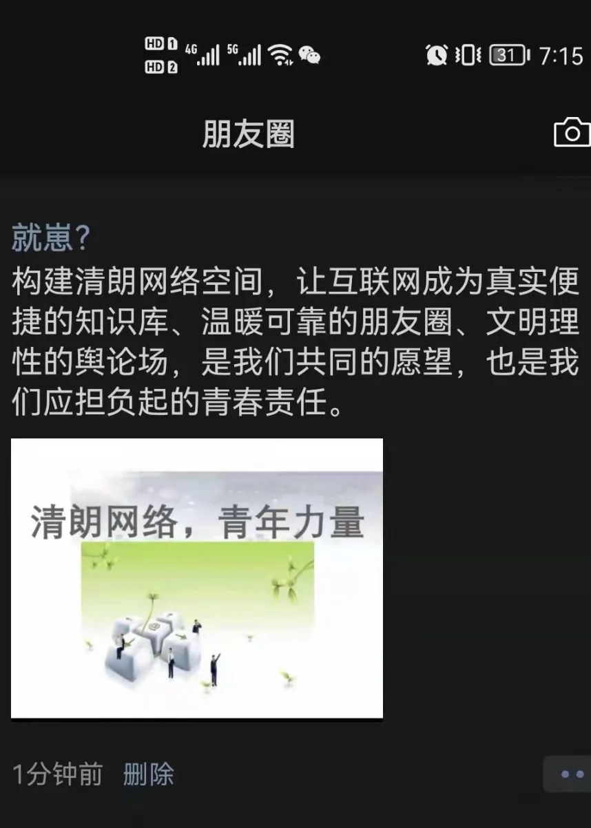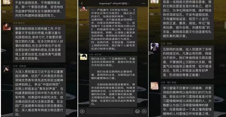 "清朗网络空间的建设,青年不做置身事外的旁观者,而要做勇于担当的生力军。这是因为,时代的进步中,有青年的责任;祖国的梦想中,有青年的梦想。清朗网络空间,看我青年力量!"