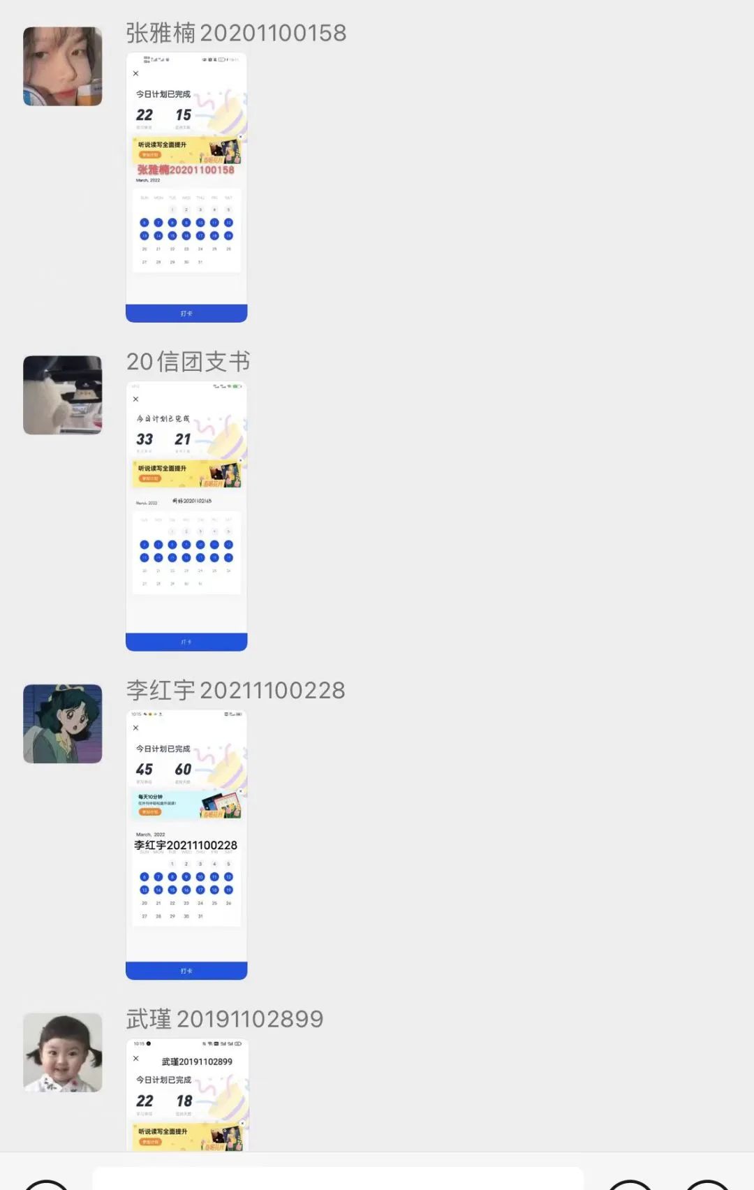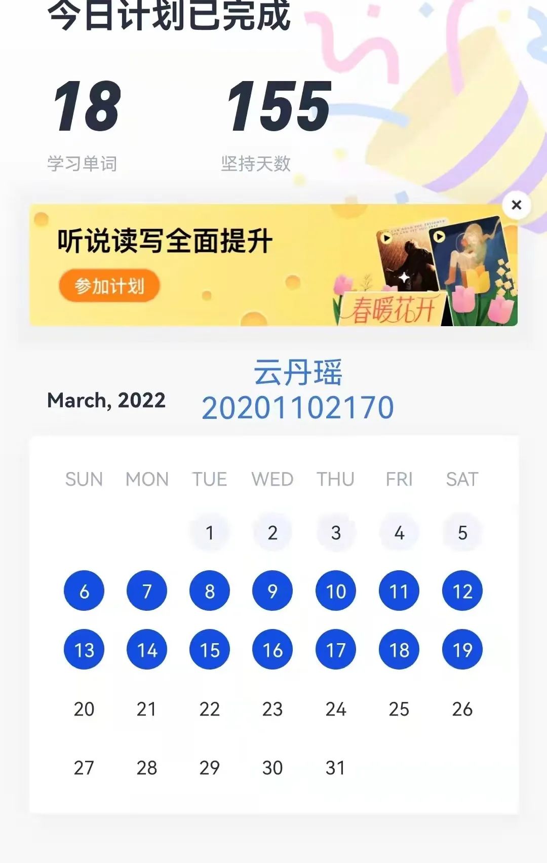 这次的单词打卡活动让同学们提高了学习的自觉性,我们更加愿意积极主动地去学习英语。打卡时候的成就感让我开心不已,我也愿意坚持下去,想看看我能走到多远。一天天的积累学习,也让我们离理想的自己更进一步。不积跬步,无以至千里。让我们一起努力吧!