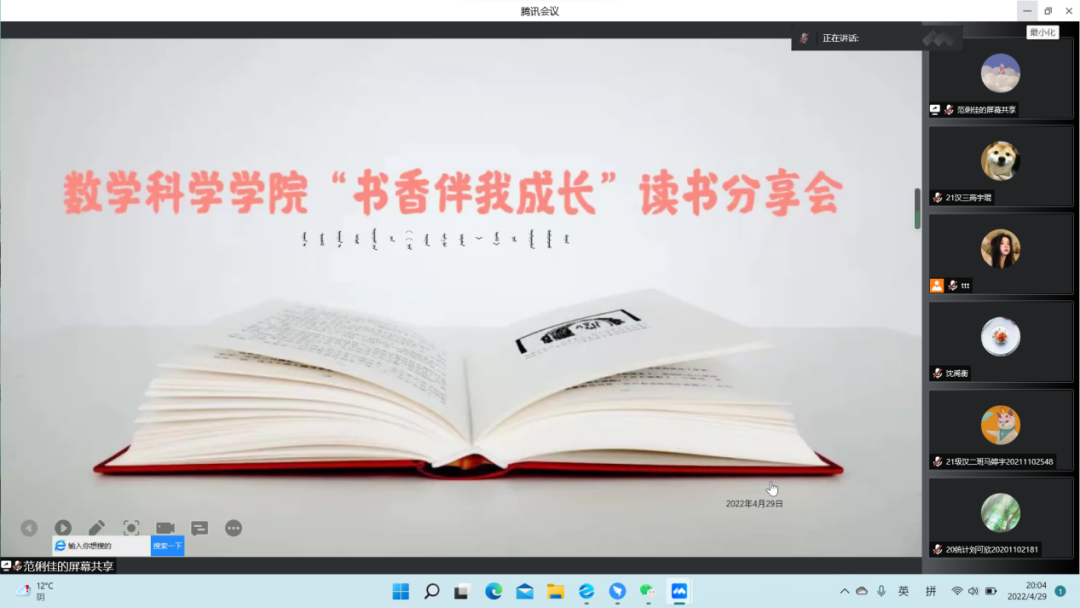 第三位进行分享的同学是19级汉一班的张语桐同学。曾获2020年校级一等奖学金,2021年校级一等奖学金,2021年乌兰夫奖学金。分享的书籍为《人生海海》。