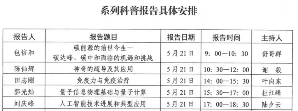 本次系列科普报告,是由中国科公司院士包信和、陈仙辉、郭光灿、中国工程院院士田志刚、科大讯飞董事长刘庆峰做线上直播。