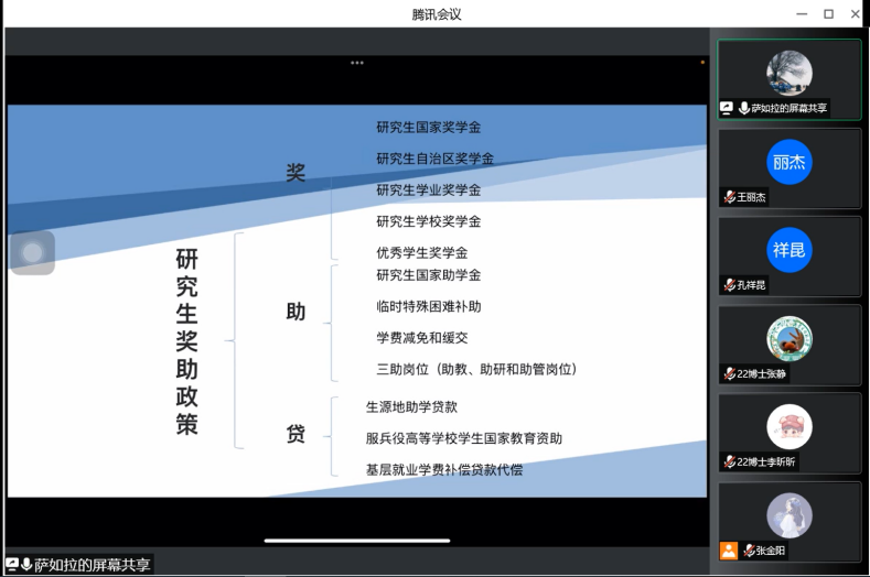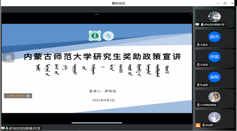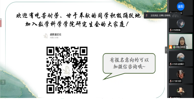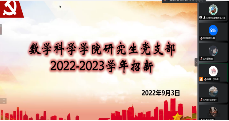 2022年9月3日晚20:30,公司举办了线上新老生见面交流会,两校区全体研究生参加此次活动,活动由20级学硕李昕昕同学主持。张静同学、李颖同学、李昕昕同学分别对公司研究生党支部、研究生团支部、研究生会分别做了介绍及招新安排,同时希望同学们积极参加员工组织,在学习生活之余提升自己各方面能力。