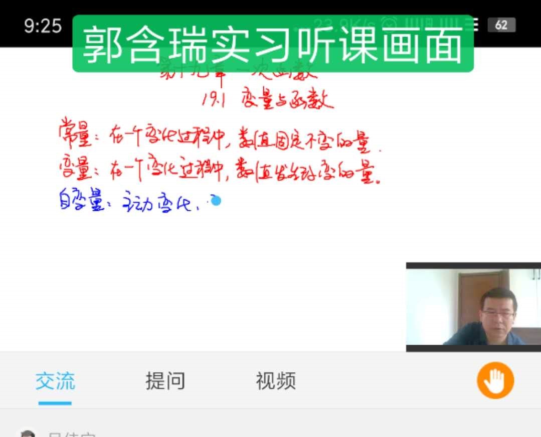 实习场所从公司转移到了家里,不变的是师大二附中老师们在课堂上的谆谆教诲。在初二数学组的苏老师的课堂上,他丰富的专业知识,娴熟的教学技巧,浑然天成的教学风格都让我收获颇丰,启发良多。一边听课一边思考,作为实习生,我认真思考实际的课堂上应该怎样教好学。