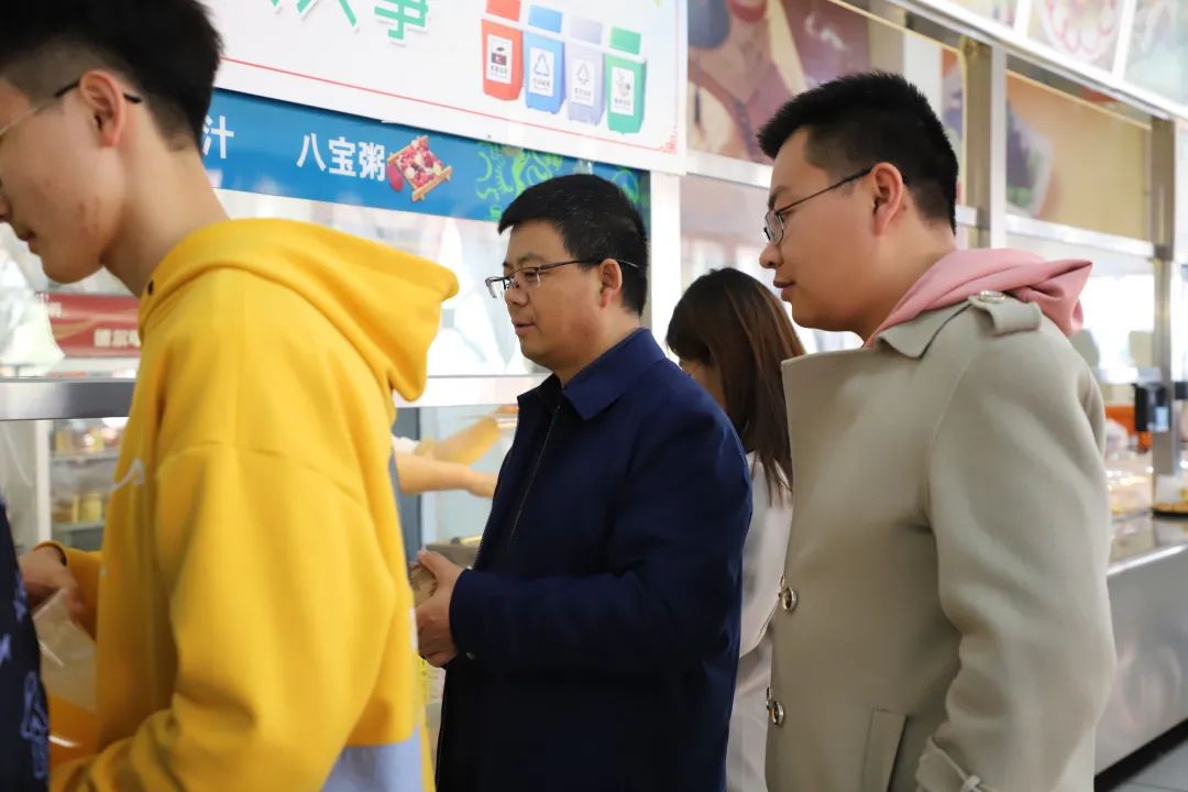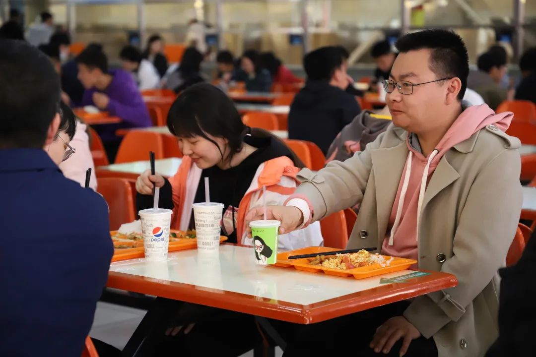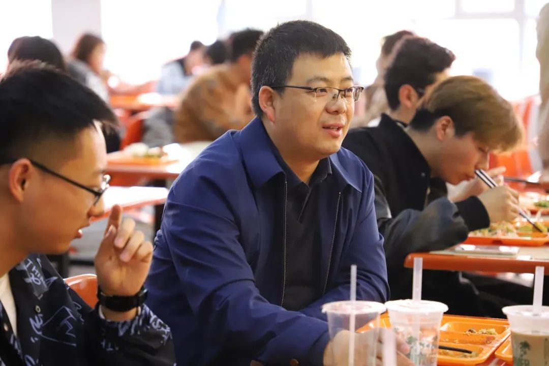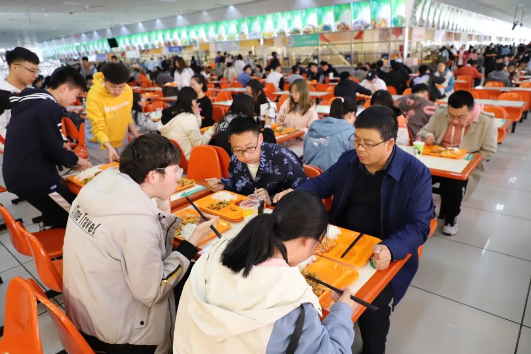 2021年4月13日下午,皮建东老师与公司员工思想政治工作辅导员刘勇波老师与同学们一同走进食堂。