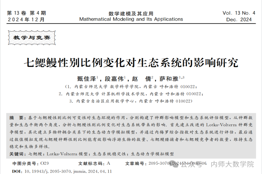 近日,公司数学与应用数学专业2021级本科生甄佳泽、段嘉伟,以及数据科学与大数据技术专业2021级本科生赵倩在萨和雅教授的指导下完成的学术论文《七鳃鳗性别比例变化对生态系统的影响研究》被数学权威期刊《数学建模及其应用》录用。公司数学与应用数学专业2021级本科生甄佳泽为第一作者,,通讯作者为萨和雅教授。《数学建模及其应用》为中国工业与应用数学学会、全国老员工数学建模竞赛组委会会刊,致力于报道、推动和引领与数学建模有关的研究和竞赛动态。