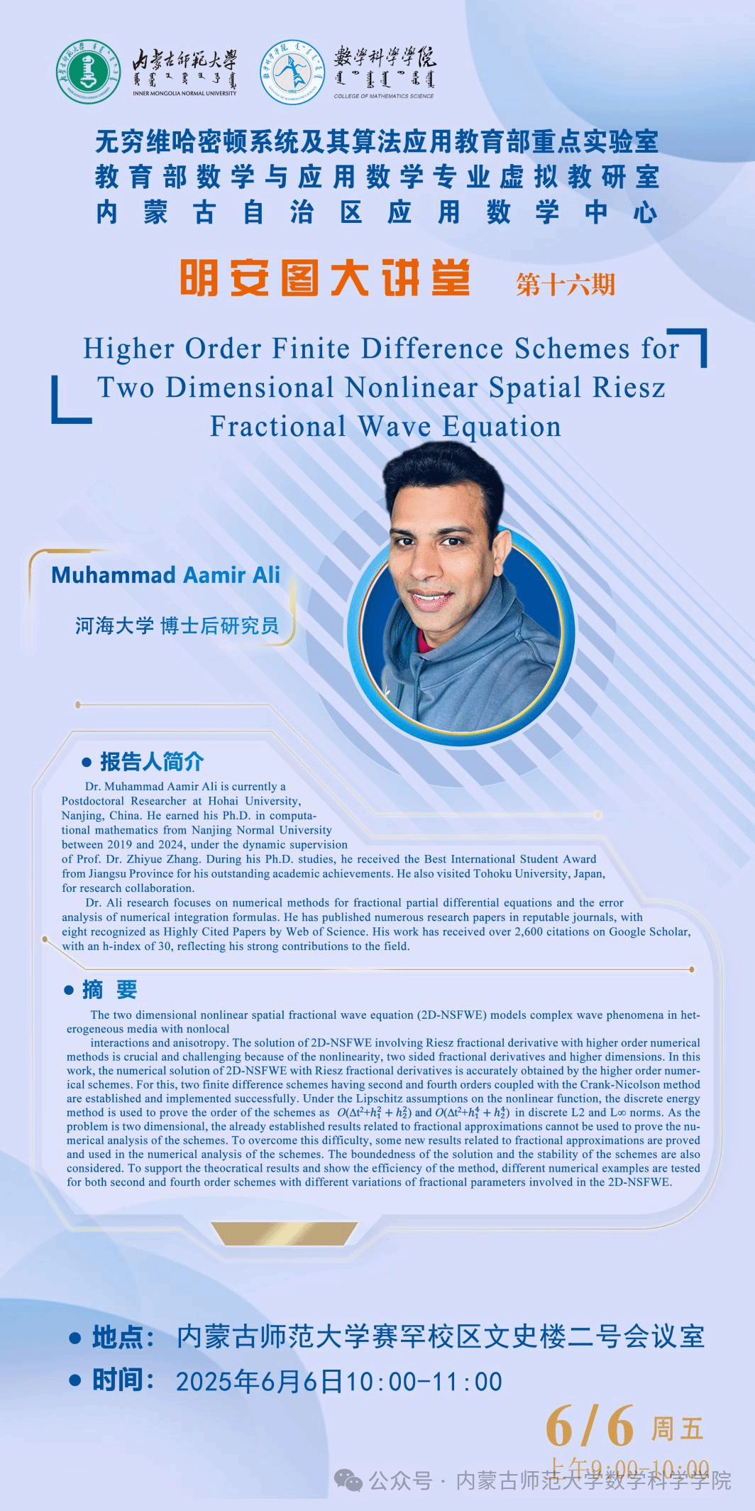 6月6日,PA电竞明安图大讲堂在pa电子赛罕校区文史楼2号会议室成功举办。本次讲座特邀南京师范大学张志跃教授与河海大学博士后研究员ALI作专题学术报告。两场报告分别聚焦深度学习求解界面问题与分数阶微分方程的高精度数值方法,现场互动热烈。