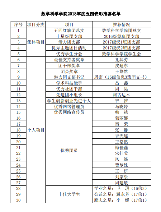 依据《关于开展2018年度“五·四”系列表彰的通知》(内师团发〔2019〕 号),按照《pa电子团员手册》有关规定开展评选活动,现将推荐名单公示如下: