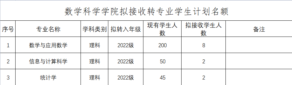 5. 接收转专业员工计划名额12人,其中数学与应用数学8人(按班级人数比例转入)、信息与计算科学2人、统计学2人。