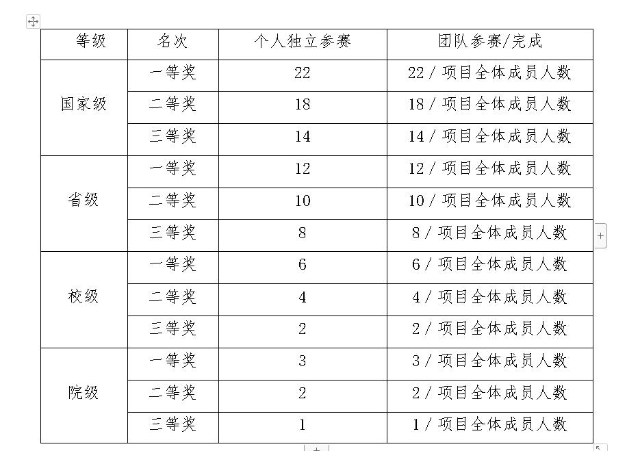 说明:①员工积极参加公司及以上级别的各类竞赛活动可以加分, 每次加 0.4 分,如:体育、文艺、演讲、征文、知识竞赛、数学建模、教师技能大赛等;②获得优秀奖、鼓励奖或参加省级以上比赛未取得名次者,按照下一个等级奖项的三等奖加分。如获得国家级优秀奖的,按照省级三等奖加分,以此类推;③获得院级优秀奖加 0.5(个人)、0.2